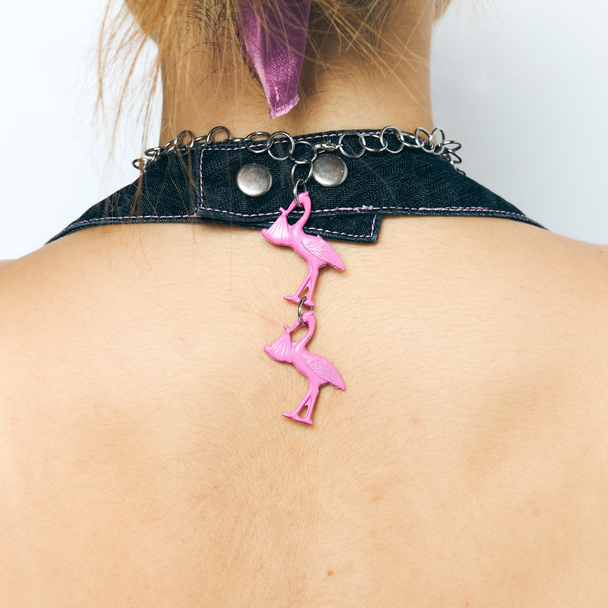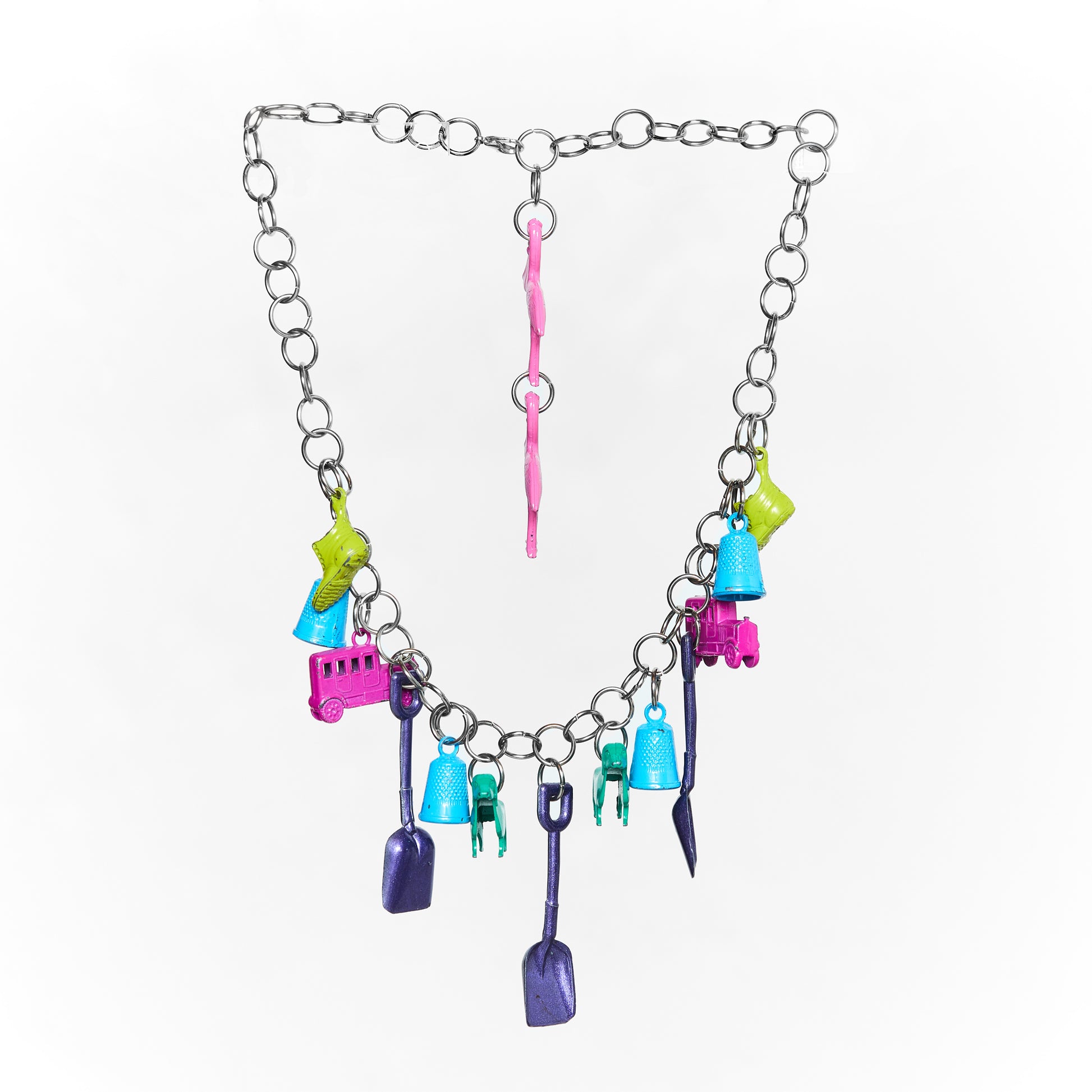 Features circa 1980s Cracker Jill charms of pink flamingos, green sneakers, blue bells, purple shovels, and green dogs, reimagined by Clio Herbert for The Jewelry Library.